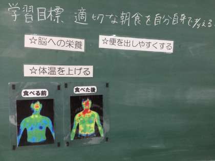 標題は「朝食について考えよう」で、家庭科の寺田先生と栄養教諭の丸山先生が、協力して授業を行っていただきました。