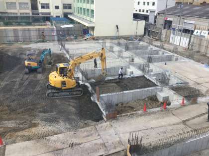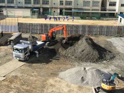 現場中央部にあった土の大きな山も、どんどんやせ細り小山と化してきています。残土の一部はダンプカーで運び出されています。
