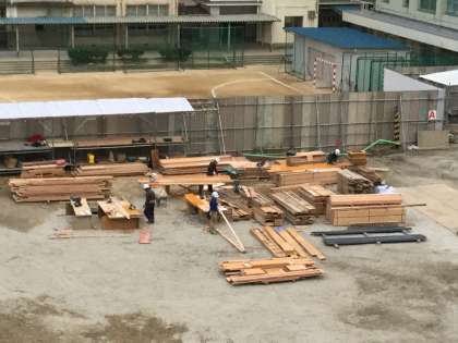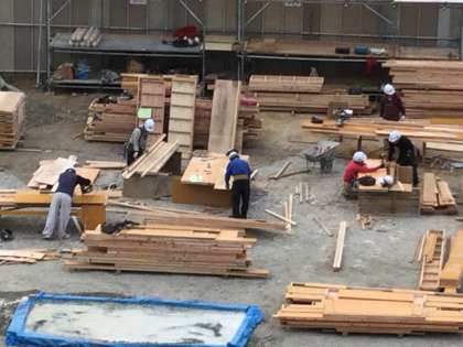 資材置き場には大量の木製の角材・板材が運び込まれてきました。大勢の作業員さんが、さながら製材所のようにせわしげに働き、木を切ったり釘を打ちつける音が現場にこだましています。