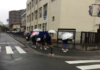 12月3日(月)はあいにくの雨のため、傘をさしての登校となり、放送を利用しての全校集会となりました。
