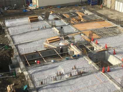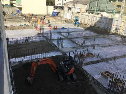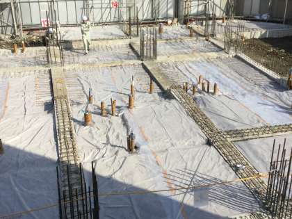 新校舎建設現場では、先週末に地下配管設置が済んで、砕石できれいに均されたところに、湿気対策としての白いシートが被せられていきました。