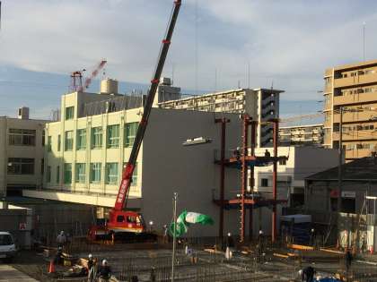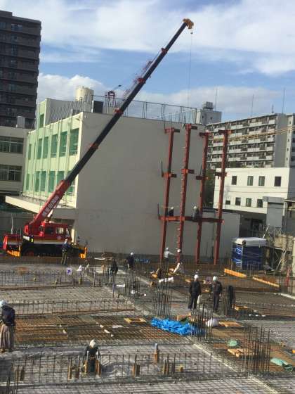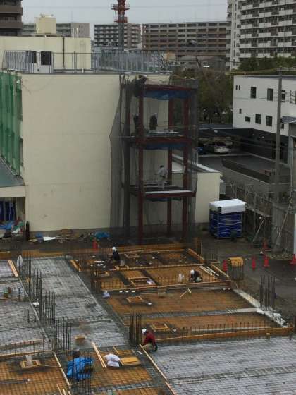 クレーン車で釣り上げられて、6号館横に組み立てられていきました。夕方には4本足の3階建ての塔が出来上がりました。今日はそれぞれの階の床などの設置工事が進められています。