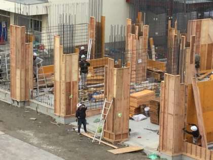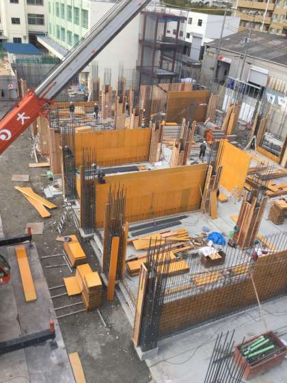 同時に柱と柱をつなぐ壁のなる部分の、鉄筋の設置が進んできました。鉄筋のマス目が見えるところでは、型枠がどんどんつなぎ合わされていきました。