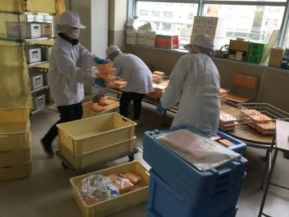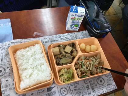 4時限目が終了するとすぐに、グループで2階のピロティーに向かい、給食かごや牛乳缶を素早く教室へ運びこみ、手際よく配膳されていました。