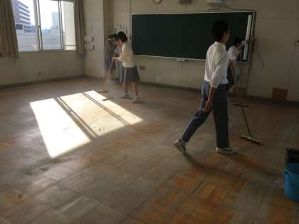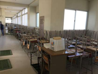 各学年とも昨日の大掃除できれいになった教室から、教習用机・椅子を廊下にところ狭しと出して、教室の中は空っぽです。