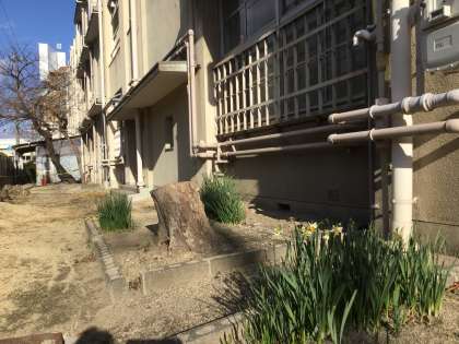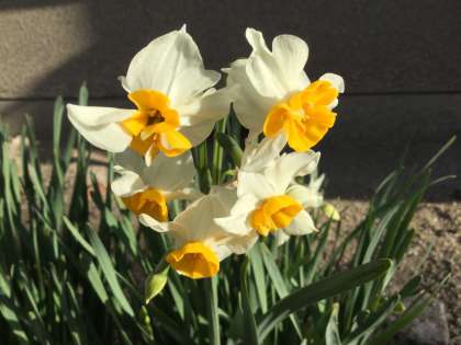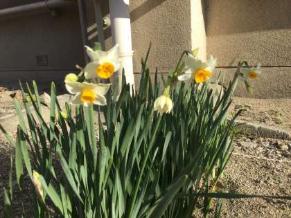 この厳しい陽気にも関わらず、4号館校舎の道路側で寒さに耐えて、何株かの水仙が花を咲かせています。風が吹き抜ける寒い場所ですが、お昼過ぎから夕方にかけて太陽があたる場所です。