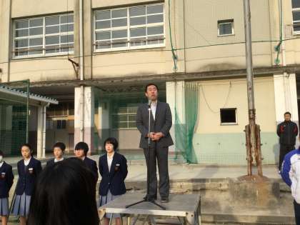 生徒指導の古澤先生から、先週の登校指導週間皆さんよく守れていましたとお褒めの言葉がありました。同様に新入生保護者説明会で、ここ2〜3年で歌島中学校の生徒がすごくよくなりましたと言われましたとのお話もありました。このことはここに並んでいる皆さんの頑張りを評価したものです。