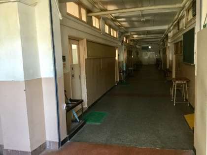 3号館校舎2階の、昼休みの様子です。ここには1年5・6・7組の教室があり、いつもなら生徒の声が響いている時間ですが、電気が消されひっそりとしています。