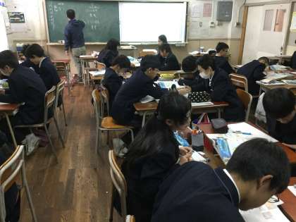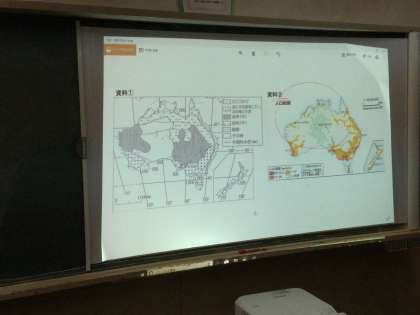 オセアニアの自然環境について、自然環境の違いから生ずる、地域の特性を考えていました。班の形式で、地図帳や資料を使ったり、液晶プロジェクターを利用してのカラフルな授業でした。