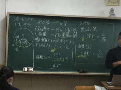1年7組の数学の研究授業では平面図形で、おうぎ形の弧や面積についての学びでした。