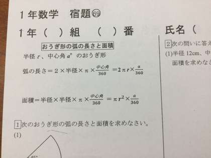 おうぎ形の半径と中心角から弧の長さや面積を求めていました。