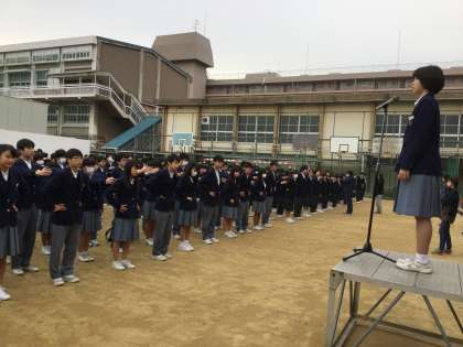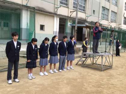 1月28日日(月)全校集会を第1グラウンドで行いました。生徒会長の指揮のもと、自主的に整列していました。