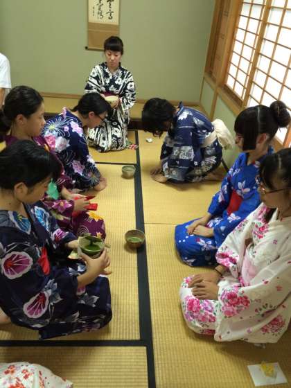 顧問の指導のもと「ゆかた」を着た茶道部員が、あざやかなお点前をしてくれました。