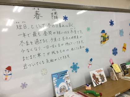 図書室の書架の上にあるホワイトボードには、図書館補助員さんによる「春隣(はるとなり)」が飾られていました。昼間の時間は冬至に一番短くなりますが、以後一日一日と