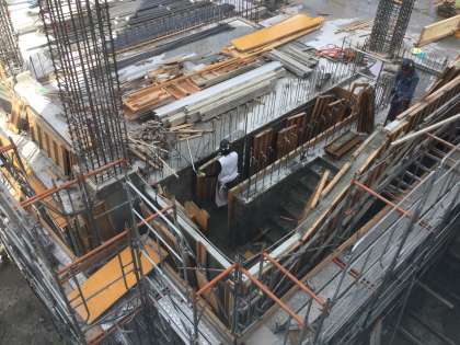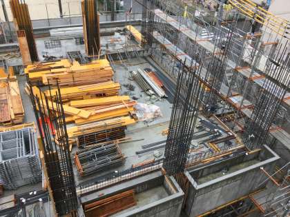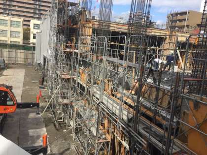 型枠が外れた現場ではすぐさま足場が組み立てられ、2階部分の型枠用の資材が積み上げられていきました。