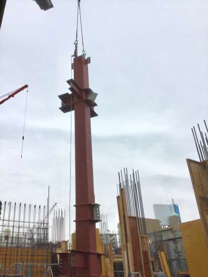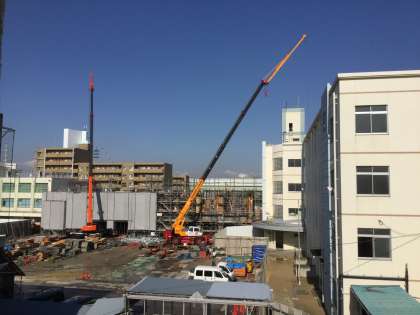 クレーン車が鋼材を吊り上げ、1号館校舎よりはるかに高い位置までアームを伸ばしての作業でした。横から見ていると1号館を覆うような感じにも見えました。吊り下げられている鋼材は、肉厚の角材で接続用の接手がいっぱい出ていました。