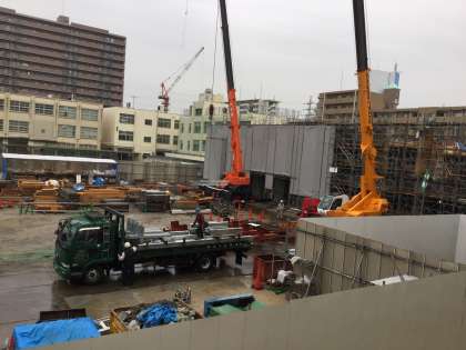 6日の朝から、いつも作業しているクレーン車に加えて、より背の高いクレーン車がやってきました。大型のトラックが現れ、荷台には長く重そうな鋼材を満載していました。トラックから降ろされた鋼材が、何本もきれいに寝かされていました。