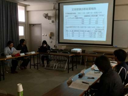 生徒達の健康状態、食生活、学校での健康状況等の意見交換をしました。また最近の学校近辺のインフルエンザのり患状況等の情報交換もありました。生徒達が健康で安全な生活を送れるようにする委員会でした。