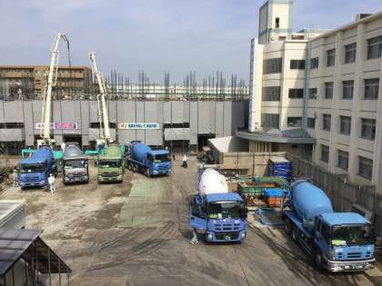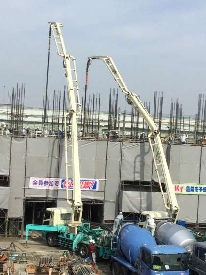 新校舎(7号館)のコンクリート打設の始まりです。いつものように4台のミキサー車から生コンクリートが大量に吐き出され、ポンプ車に吸い込まれて行きます。
