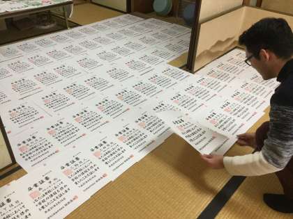 捺印後は朱肉が乾くまで、テーブルに並べて置いてます。畳にところ狭しと卒業証書の並んだ様は壮観です。押印作業は本日に引き続き明日も行い、319枚の卒業証書が完成となります。