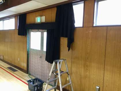 今まで行事等で光が差し込むこともありましたが、今回の修理で暗幕の機能が回復しました。卒業式に向けての式場整備でした。