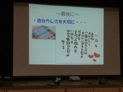 岩尾先生は命を大切に守ってくださいと話されました。生徒達は静かに集中して話を聞いていました。命の尊さを理解し、自分を大切にして、自らよりよく生きること学んだ授業でした。教室へ帰ってから、2日間の学びを各自がワークシートにまとめ記入しました。