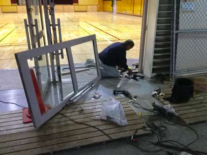 フロアーヒンジを取り除いて後には、以前よりコンパクトになったものを取り付けていただきました。