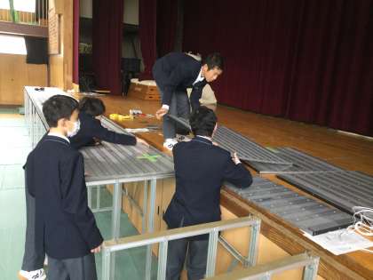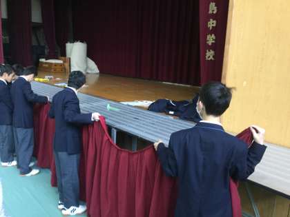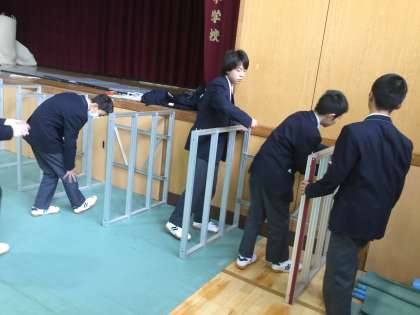 組み立て式の張出舞台や階段の設営では、生徒達もボルトを締めたりパネルを載せたりと大活躍でした。