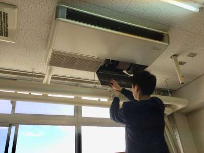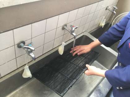 背の高い生徒がエアコンのフィルターを取り外し、受け取ったフィルターを丁寧に洗ってくれた生徒のグループもありました。