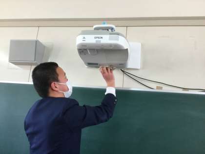 3年生の教室の黒板には、液晶プロジェクターが取り付けてあります。上面にほこりが積もりやすく、雑巾で拭いているクラスもありました。