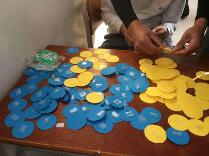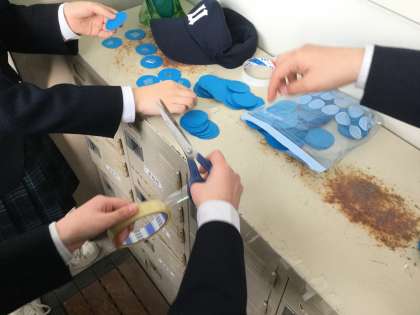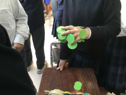 1・2年生が各クラスで分担して、虹色のカラフルな画用紙を丸く切り抜きました。