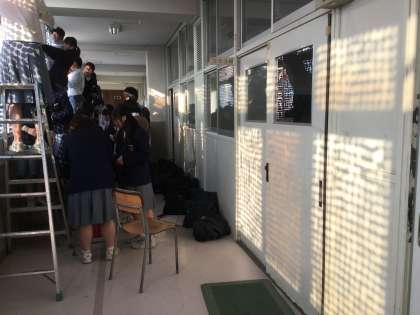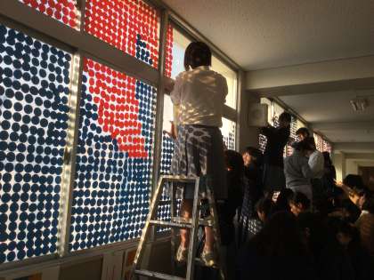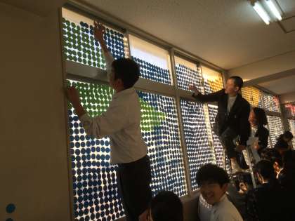 作業は急ピッチで進み、大きなガラス面が上から下まで埋め尽くされていきました。