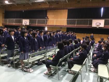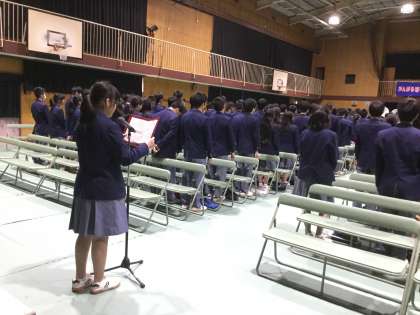 下の写真は、3年生が後ろを向いて1・2年生と対面している場面です。