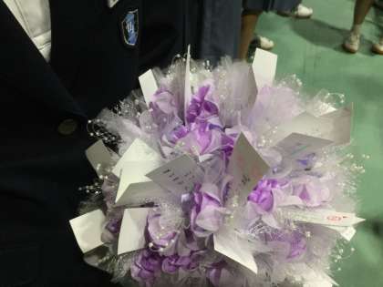 手作りコサージュは、2年生各クラス委員長から3年委員長へ手渡で贈呈されました。記念品の花は、メッセージ付きの色鮮やかな紫色の花でした。明日の卒業式では、卒業生の胸元を飾ることになります。