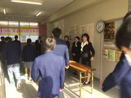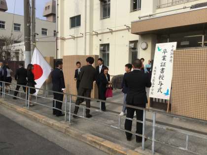 3月14日(木)の卒業式の朝は、この時期として厳しい寒さのもとでの卒業式となりました。集合時間より早く登校してきて、1号門前の看板や日章旗を眺めての登校でした。玄関では先生方とあいさつを交わして慣れ親しんだ教室へ向かって行きました。