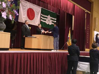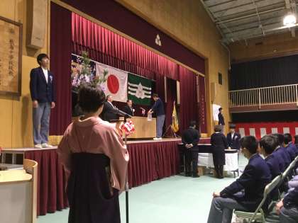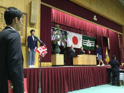 「卒業証書授与」では、卒業生は壇上の脇にあがり、担任の先生に名前を呼ばれ「はい」と返事をして、舞台中央へ進みます。校長先生に正対し丁寧にお辞儀をし、卒業証書を手渡しでいただき、脇に証書を挟み、お礼のお辞儀をします。どの生徒も大きな声で返事をし、深々としたお辞儀で好感が持てました。