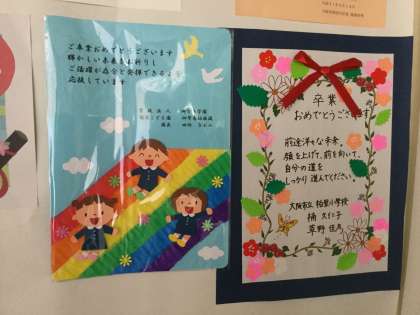 柏里小学校の先生からはカラフルな飾り付きの、祝辞がありました。御幣島幼稚園からは、画用紙を切り抜いたかわいいい子供のメッセージがありました。
