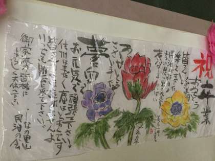 修学旅行の思い出の地、しなの里山民泊の会からは、絵手紙の大きな祝辞をいただきました。