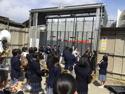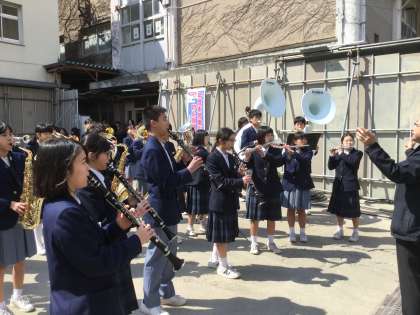 3年担任を先頭にして、体育館から仮設の渡り廊下を通って校門へ向かう途中で、吹奏楽部の演奏がありました。ゲート前では区長さんはじめ来賓の方、保護者の方にも音楽を聴きながら生徒たちの旅立ちを見ていただきました。1号門を後にして第2グラウンドへと向かいました。