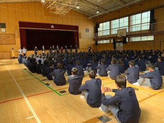 3月15日(金)の5・6時間目に体育館で、2年生対象の職業講話が行われました。始めに校長先生より、11人のさまざまな職業の方の紹介がありました。