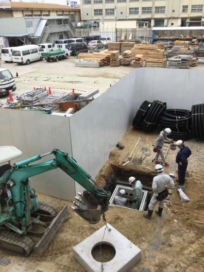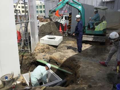 1号館沿いに数か所、大きな四角い穴が掘られて、コンクリート製のマスが設置されています。地面の掘削工事を見ていると、地下には多種多様な配管を見ることができました。下の写真はピロティー前のマスの設置工事です。