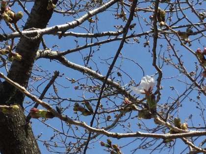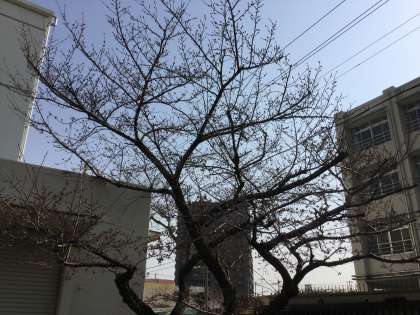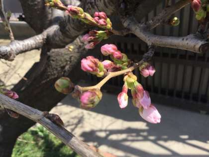 今週に入り気温が高く暖かい日が続き、正門の桜の大きくなったつぼみからピンク色の花びらが見えるようになってきました。