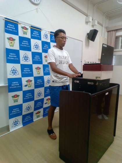 さて、集会ですが、土曜日にワールドトークという行事に校長・副校長で参加して感じたことを集会で生徒に話をしました。