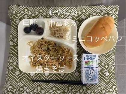 オイスターソース焼きそば・・・オイスターソースがほのかに効いていてあっさりと食べやすい。パンにも合うが、ご飯が欲しくなる味