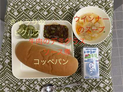 ウインナーのスープ・・・野菜やウインナーがたくさん入っており、ご飯のおかずにもなり得る一品