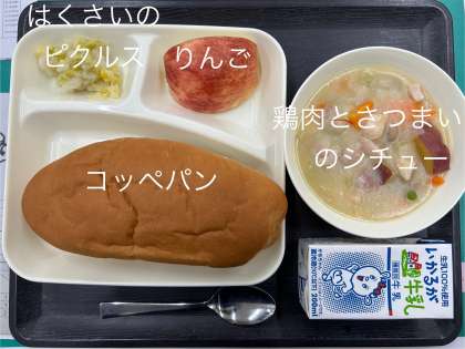 鶏肉とさつまいものシチュー・・・さつまいもの甘味が秋の訪れを感じさせる一品。昨日の豚汁にサツマイモが入っていなかったことが寂しかったのですが、今日のためにとっていたのですね。