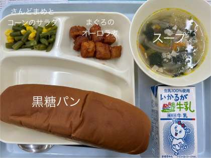 まぐろのオーロラ煮・・・まぐろは、かま焼き、お刺身以外でいただくことは珍しいのではないでしょうか。オーロラ煮はしょうが汁、赤味噌とケチャップベースで甘じょっぱい味わいのおかずになります。本日はパンですが、ご飯にもよく合う味付けです。