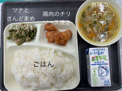 ツナとさんどまめの炒め物・・・給食の『ツナ使い』は秀逸です。通常はサラダや、オムレツといったイメージですが、様々な食材と合わせる献立を考えていただいている方の才能に嫉妬します。