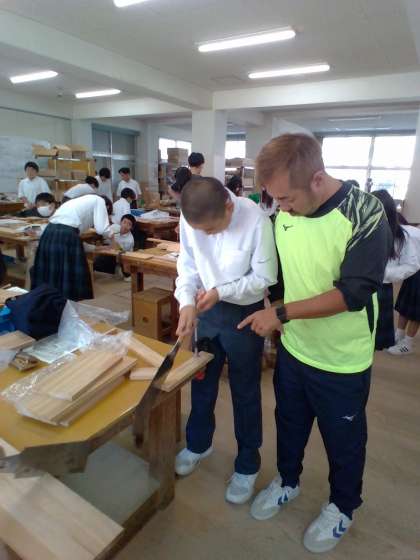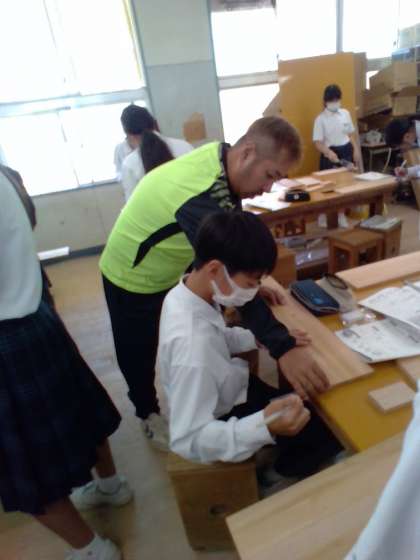 技術の授業ではノコギリを使用して木材加工を行っていました。
