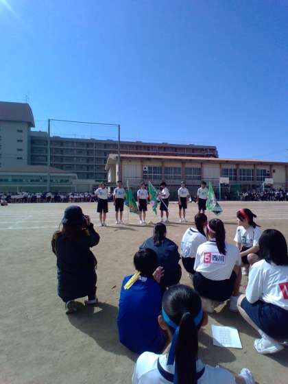 各クラスから2名ずつ代表者を選出し、1年生から3年生が6名のグループを作り。1組〜6組の対抗リレーを行いました。